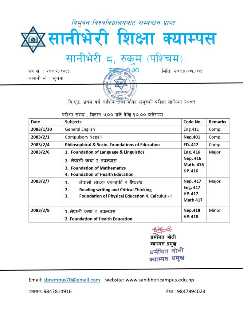 त्रिभुवन विश्वविद्यालय परीक्षा नियन्त्रण कार्यालय बल्खुद्वारा वार्षिक परीक्षा प्रणाली अनुसार २०८३ सालमा संचालन हुने २०८१ सालको ४ वर्षे स्नातक तह शिक्षा शास्त्र प्रथम वर्षको आंशिक तथा मौका परीक्षा मिति २०८३ साल बैशाख ३० गते देखि २०८३ साल जेष्ठ ८ गते सम्म हुने सुचना प्रकाशित गरिन्छ।