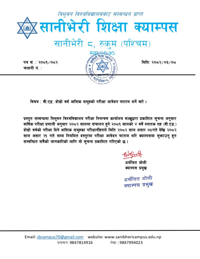 बी.एड. दोस्रो वर्ष आंशिक समुहको परीक्षा फाराम भर्ने बारेको सूचना