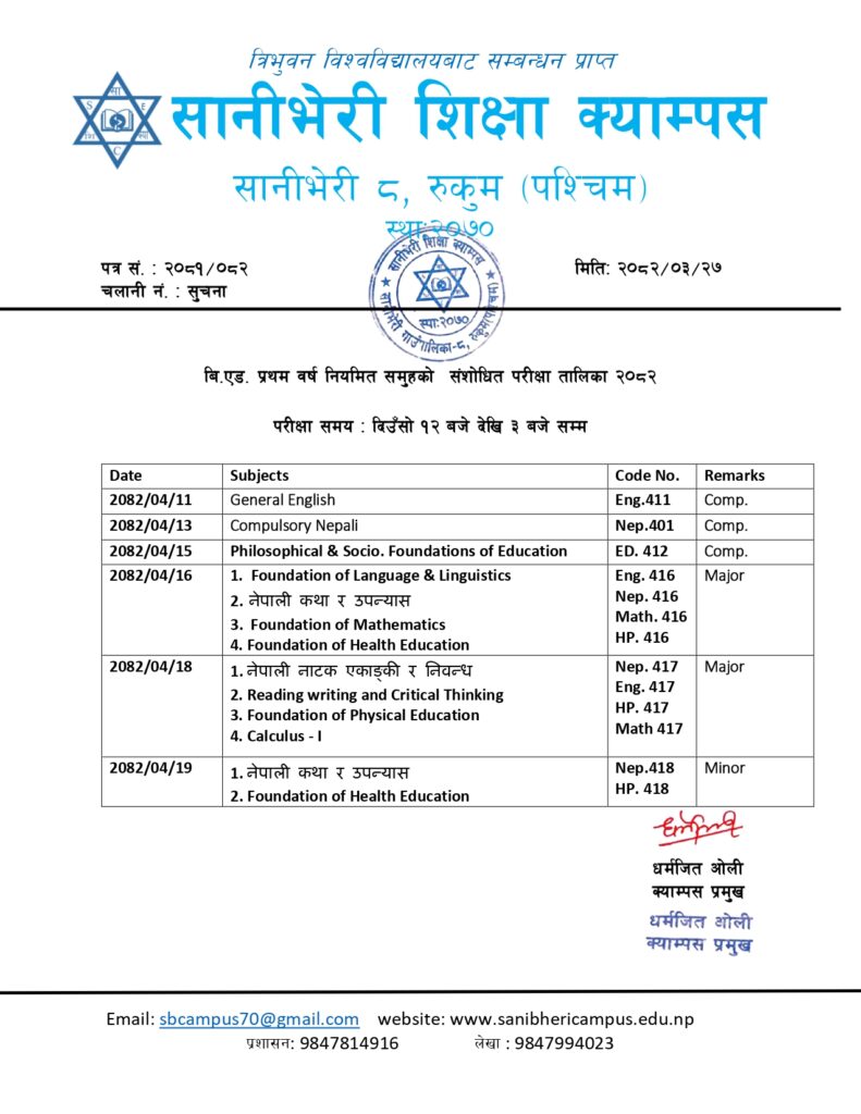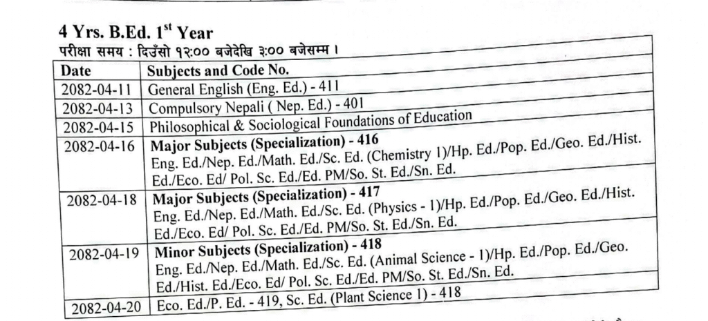 स्नातक तह प्रथम वर्षको परीक्षा तालिका दोस्रो पटक संशोधन भएको छ। संशोधित तालिका अनुसार B.Ed. प्रथम वर्षको परीक्षा मिति २०८१/०४/११ गते देखि २०८१/०४/१९ गते सम्म संचालन हुने छ । July 11, 2025July 11, 2025 admin