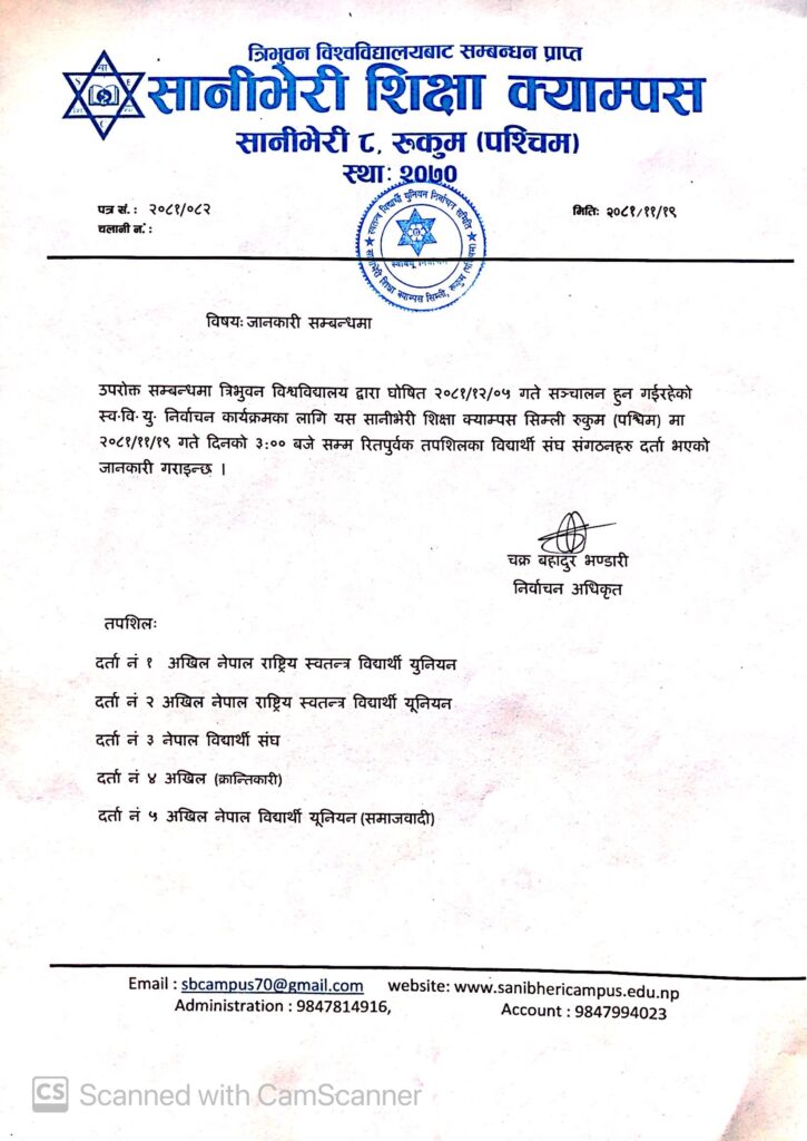 स्व.वि.यू. निर्वाचन २०८१ को लागि सानीभेरी शिक्षा क्याम्पस सिम्ली रुकुम (पश्चिम) मा निर्धारित समयसम्म रितपुर्वक दर्ता भएका विद्यार्थी संघ/संगठनहरु।